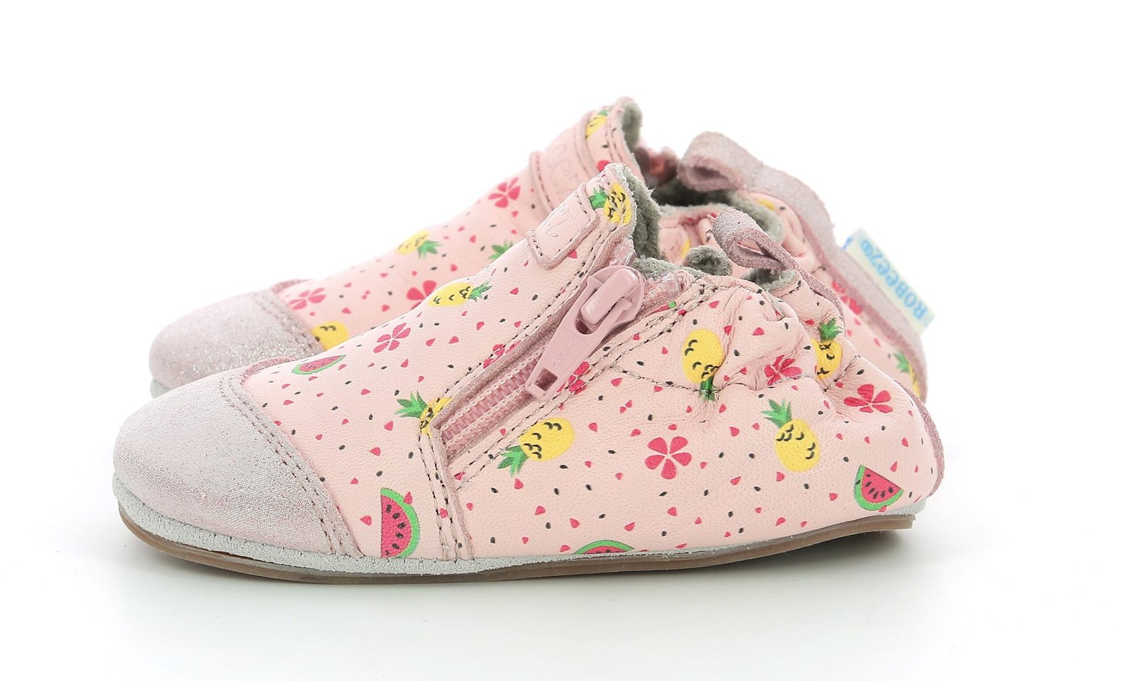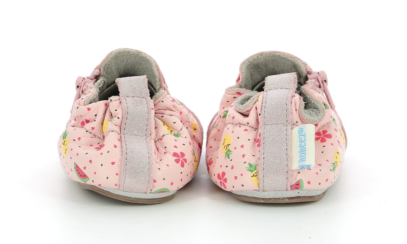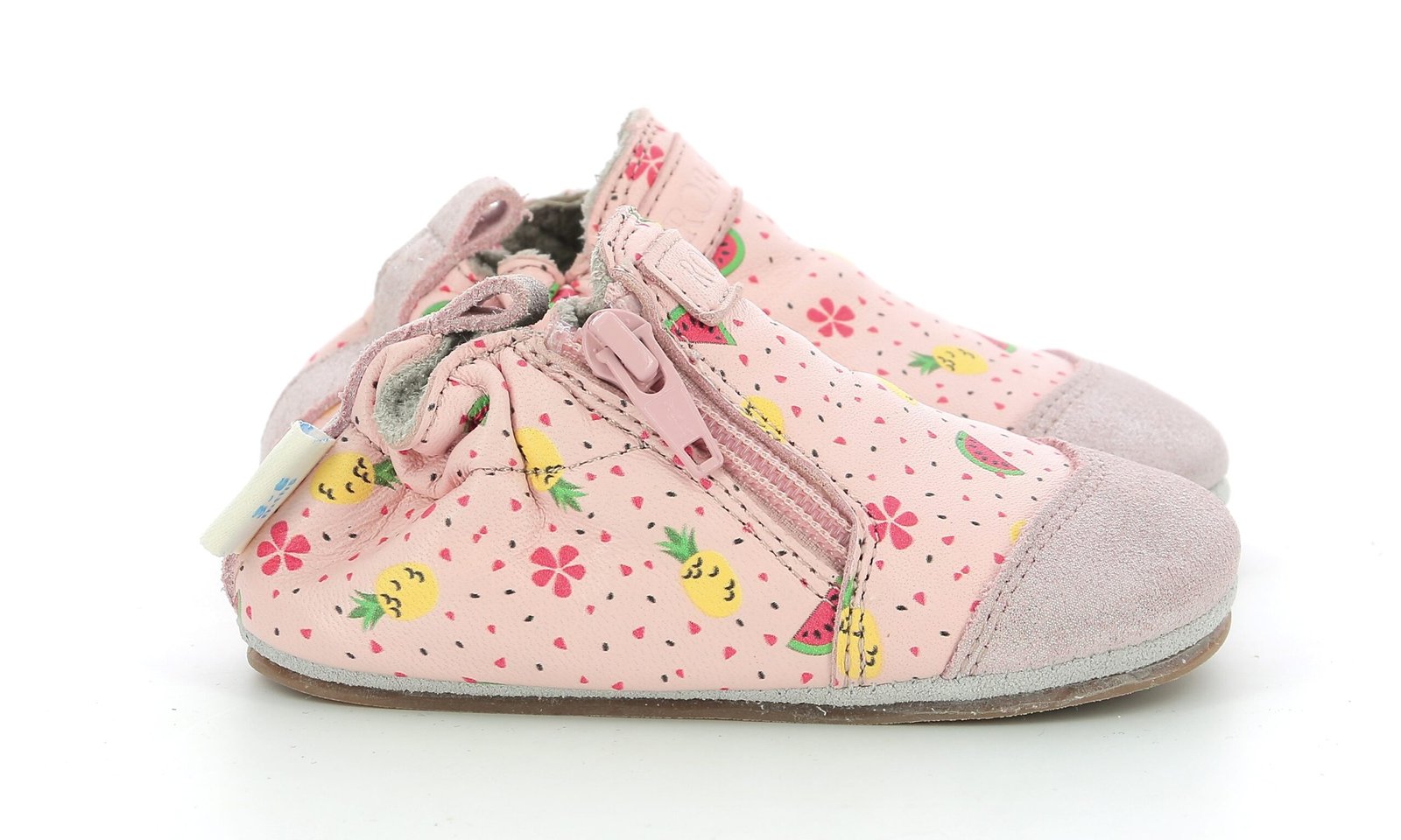 Le modèle Fruity Day est une paire de chaussons souples pour bébé fille, en cuir rose clair orné de jolis motifs fruités.