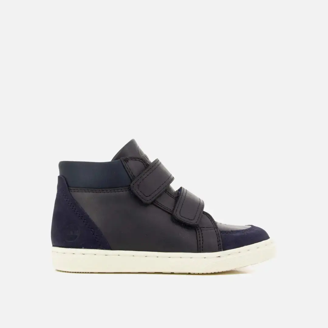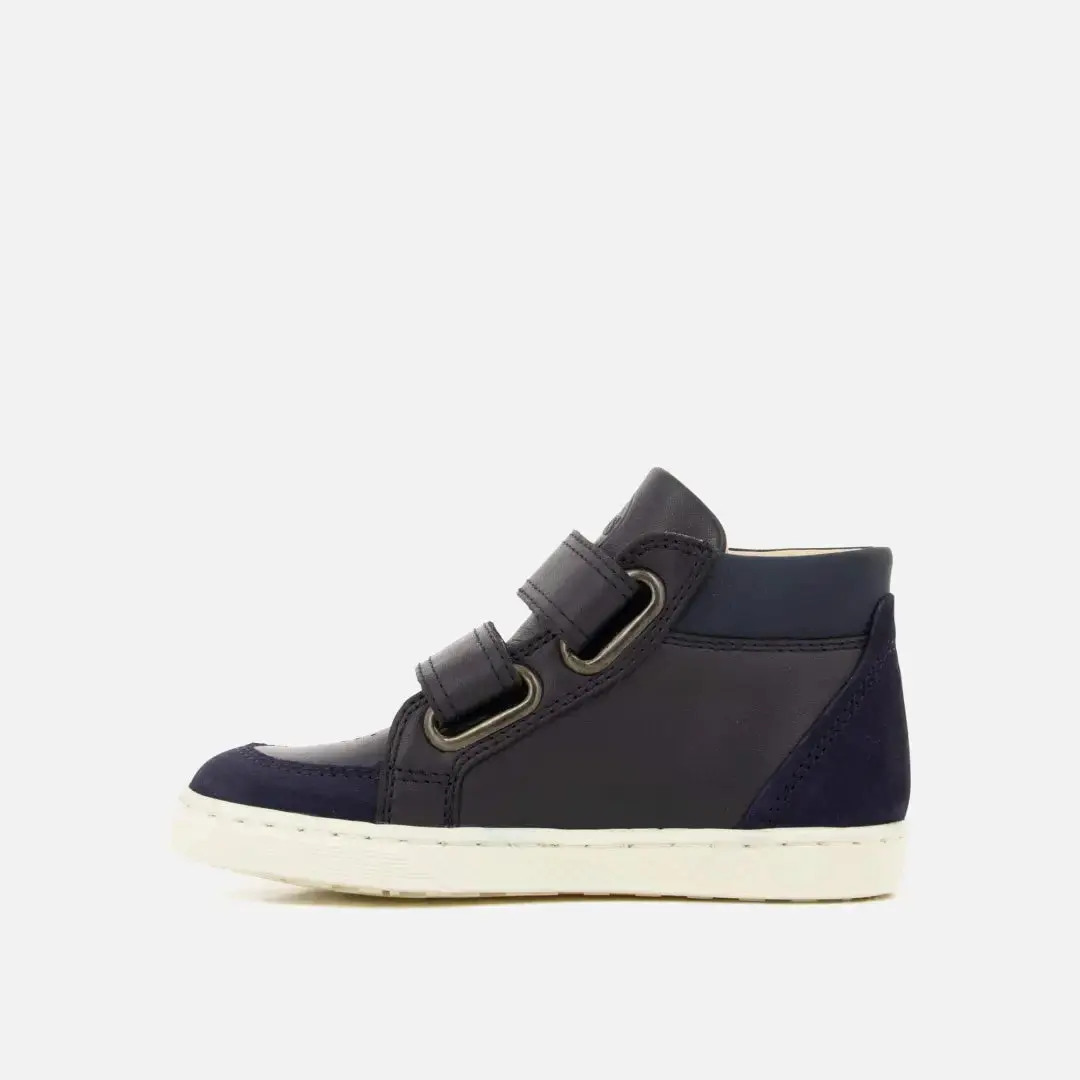Cette basket montante pour enfant, en cuir lisse et velours bleu marine, allie style et confort. Conçue avec des matériaux de qualité pour accompagner le bon développement du pied, elle s’enfile facilement grâce à ses fermetures à scratch.